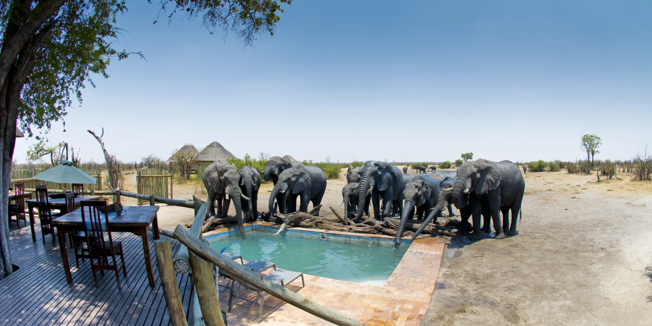 In Zimbabwe, there are several camps where you can more reliably find yourself surrounded by elephants, especially in Hwange during the Jun-Nov dry season. Properties including Camp Hwange and Little Makalolo Camp have very active waterholes out front, whilst at Somalisa Camp and Nehimba Lodge herds often come right up and drink from the pool, sometimes whilst guests are swimming. In Mana Pools the intimate Kanga Camp is built around an often very active waterhole.