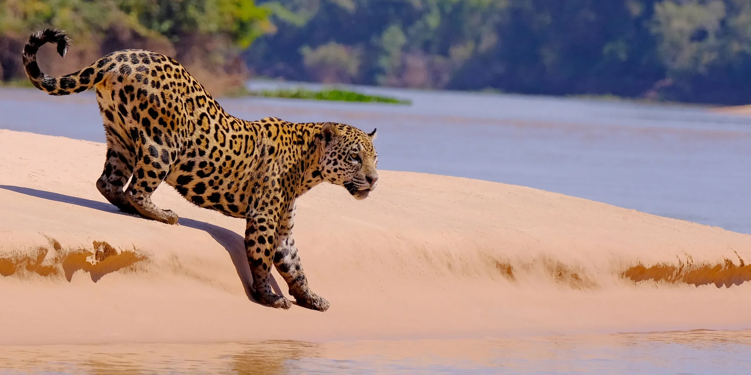 Wild jaguars are typically viewed from boats in this area, often with multiple sightings per day and hunting action. They cannot usually be approached on foot.
